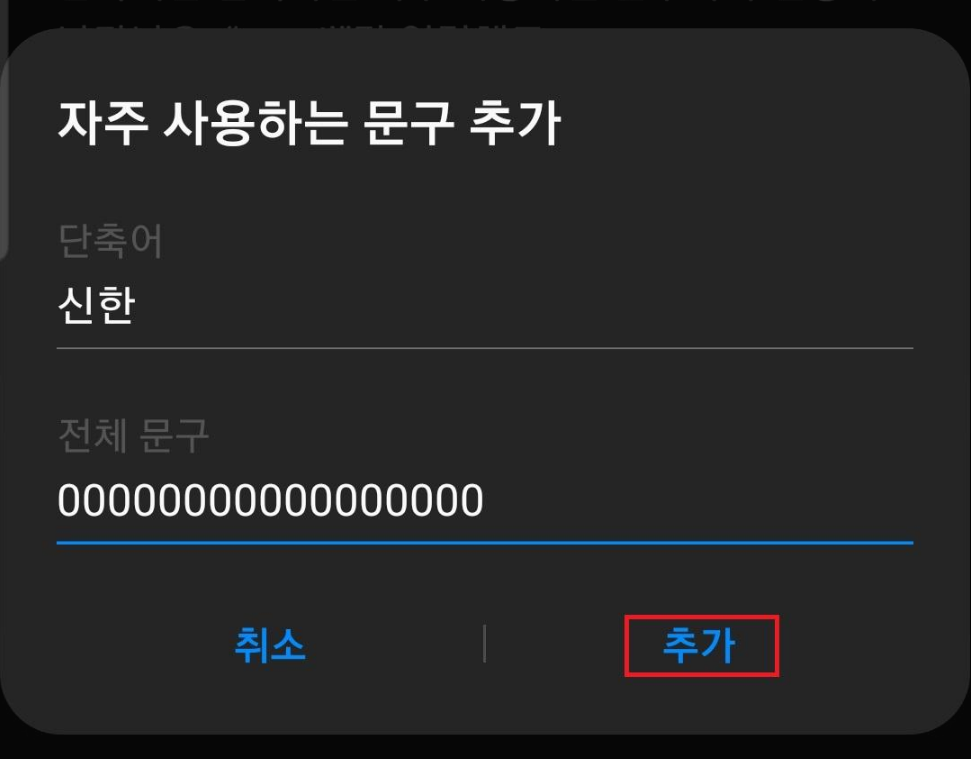 단축어엔 '신한'과 같은 본인이 원하는 단어를 넣어주시구요